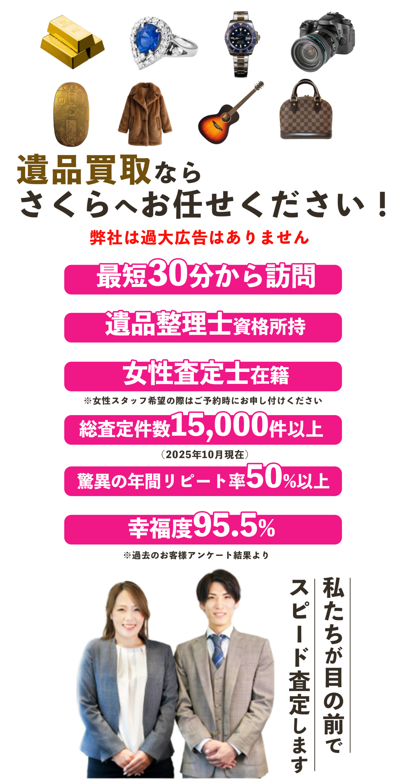 遺品整理を専門的・適正に行うための知識と倫理を備えた実績豊富な遺品査定士がご自宅にお伺いし査定いたします 。